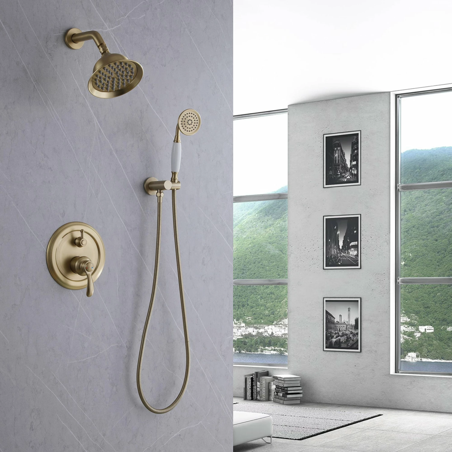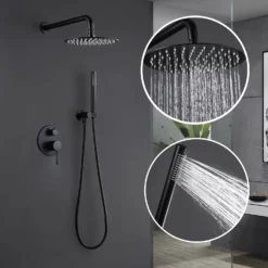 - Shower Kit Includes: 6-inch round rain shower head (Brass), handheld shower (Brass), 16 inches shower arm (Brass), 59 inches shower hose (304 stainless steel), shower holder (brass), and Rough-in Valve Body (brass)