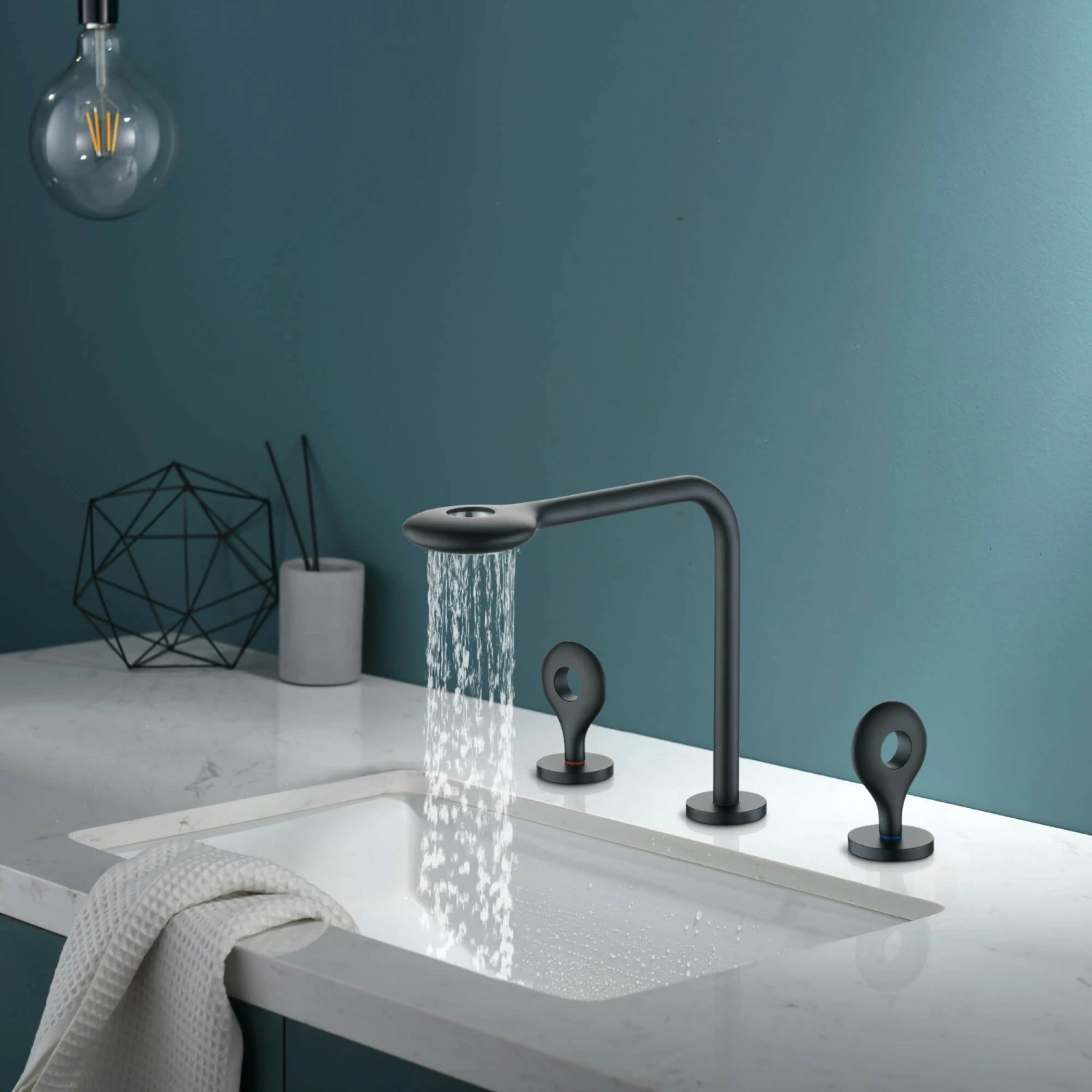 - Double handles for easy control of water temperature and flow, contemporary style rain curtain design with right angle spout which can 360-degree swivel.