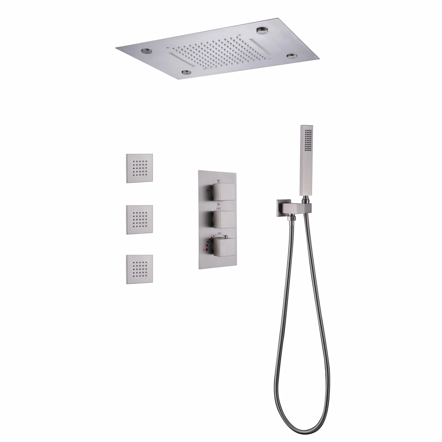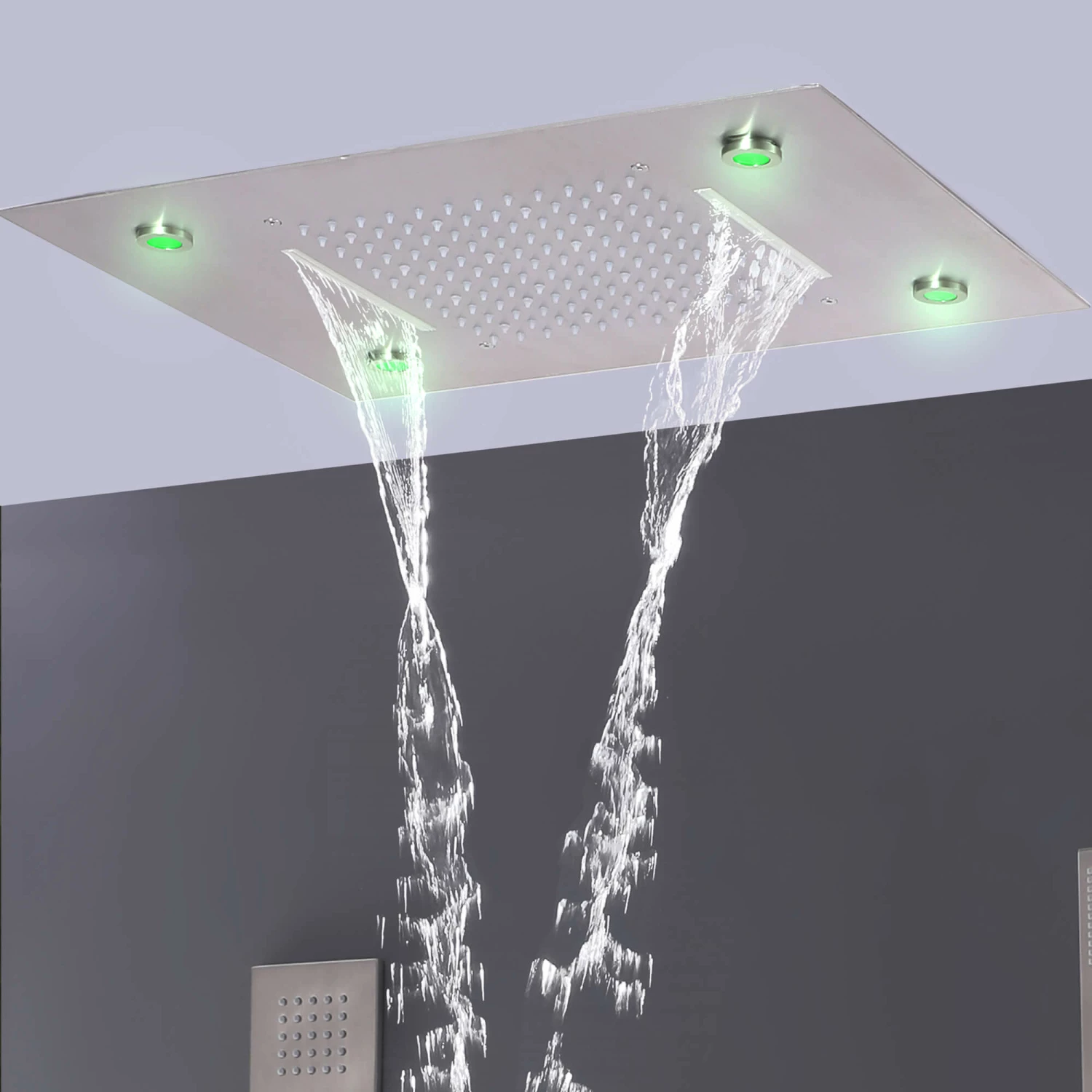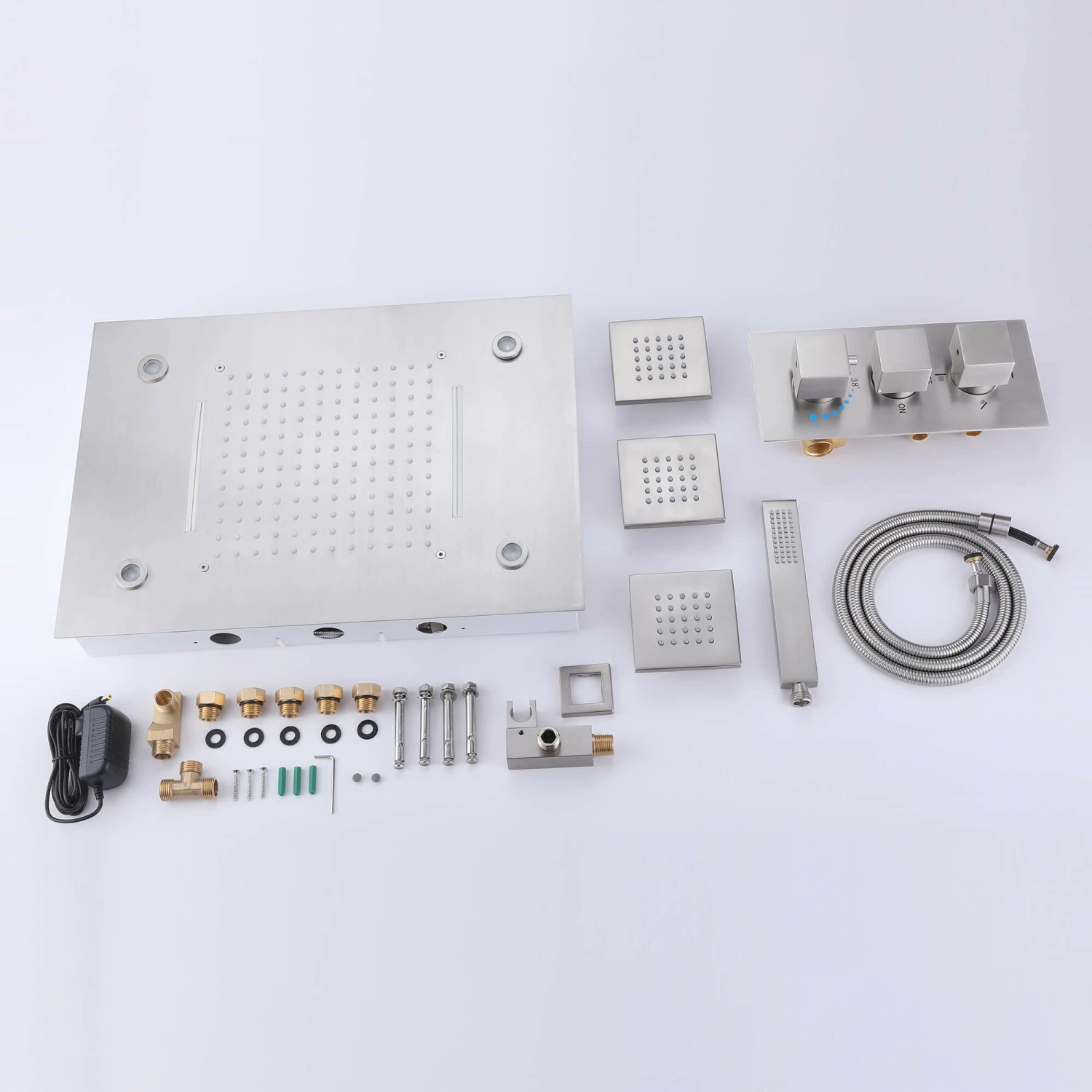 - NEW RBROHANT SHOWER SET INCLUDE —20×14 inch shower head(stainless steel 304)with LED power plug, hot and cold shower valve (brass and ABS), handheld shower(Brass), stainless steel hose,shower holder(Brass),Brass G to NPT adapters for shower head and shower valve, 3 pcs Body Jets(Brass and ABS): help you relaxing your muscles. In order to enjoy a good water experience, the recommended water pressure: 0.3~0.8 Mpa.