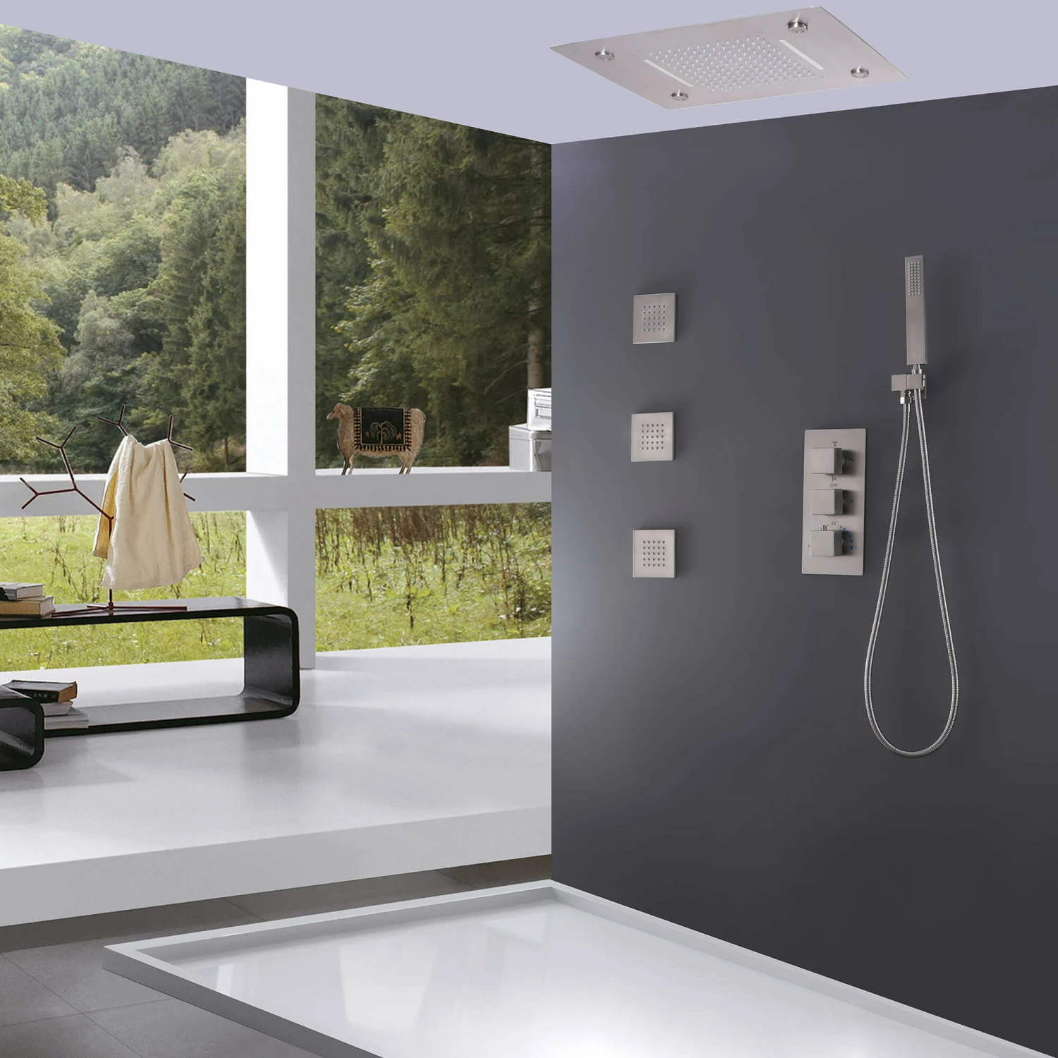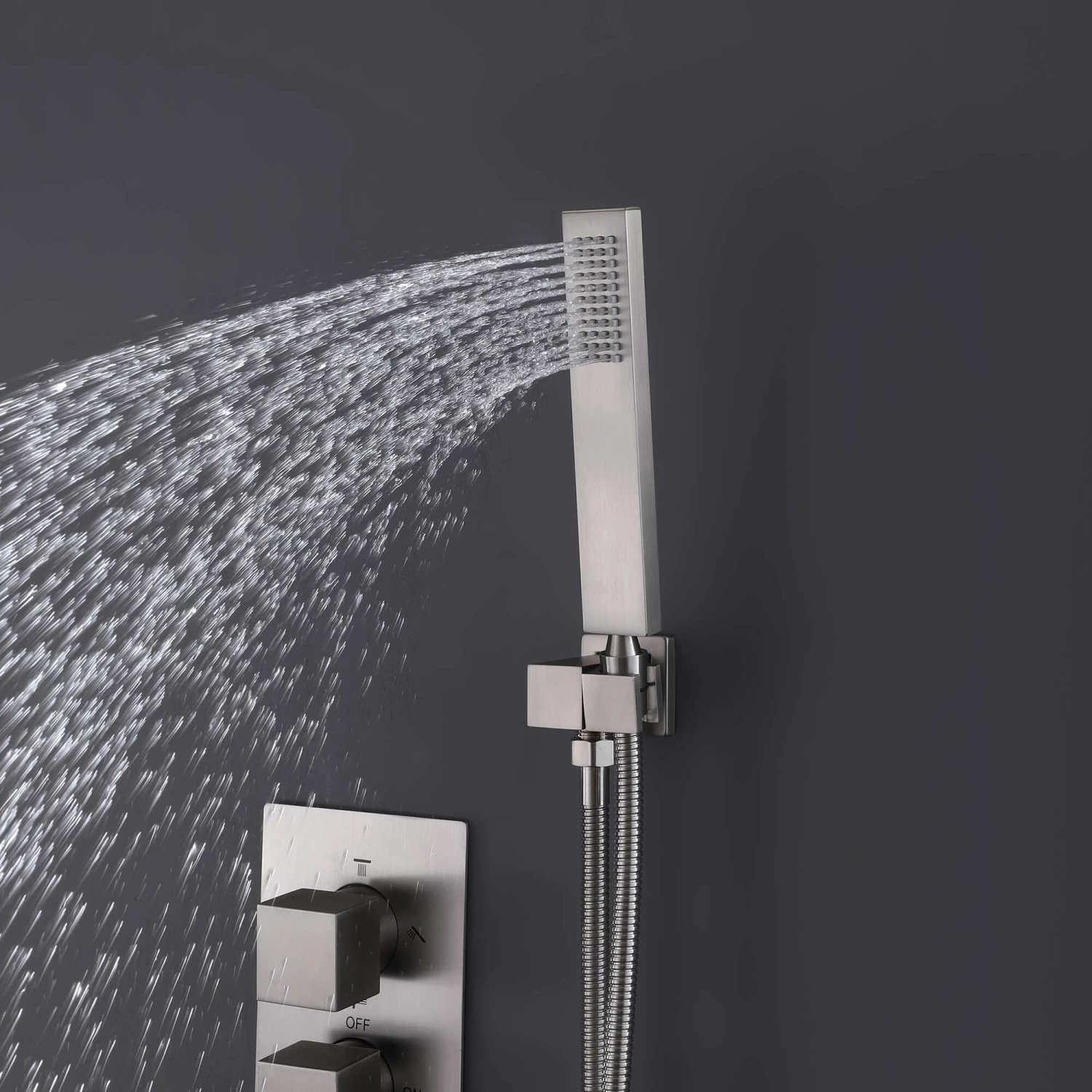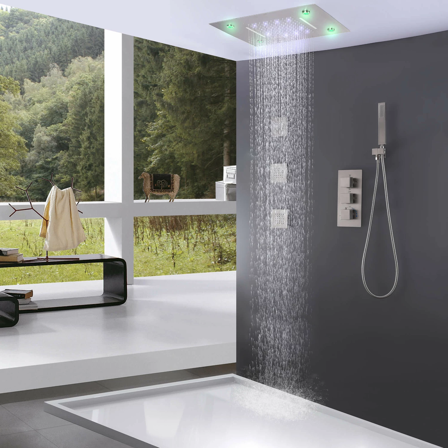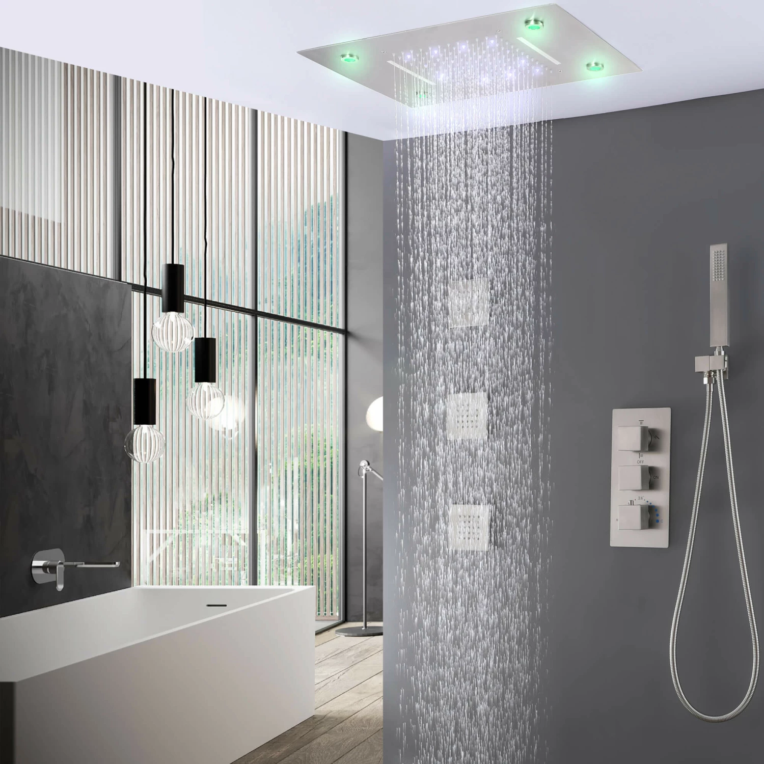 - NEW RBROHANT SHOWER SET INCLUDE —20×14 inch shower head(stainless steel 304)with LED power plug, hot and cold shower valve (brass and ABS), handheld shower(Brass), stainless steel hose,shower holder(Brass),Brass G to NPT adapters for shower head and shower valve, 3 pcs Body Jets(Brass and ABS): help you relaxing your muscles. In order to enjoy a good water experience, the recommended water pressure: 0.3~0.8 Mpa.