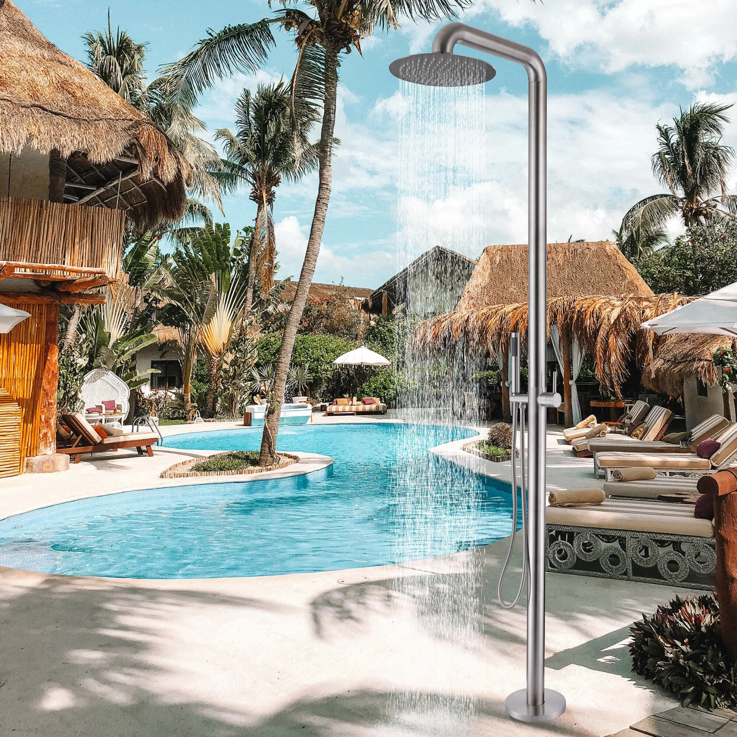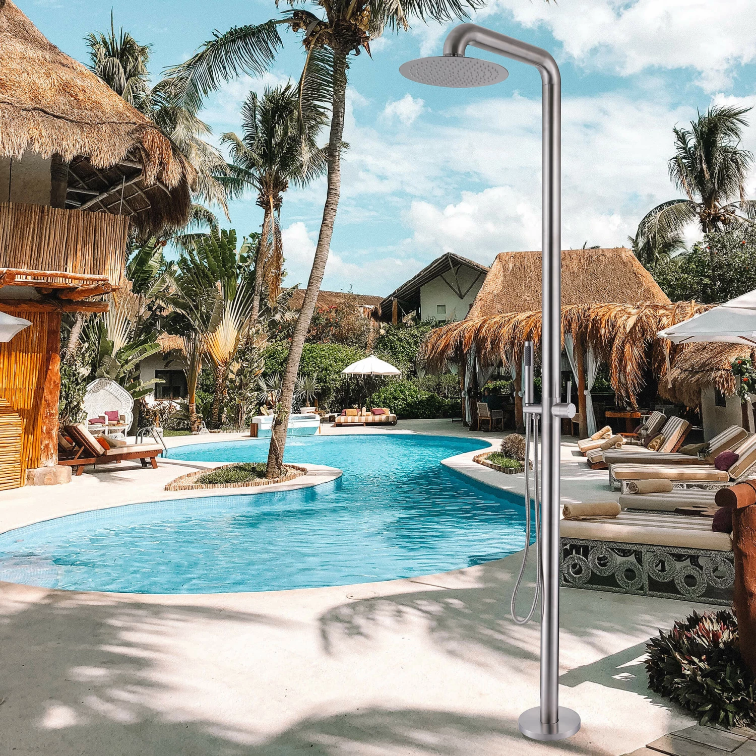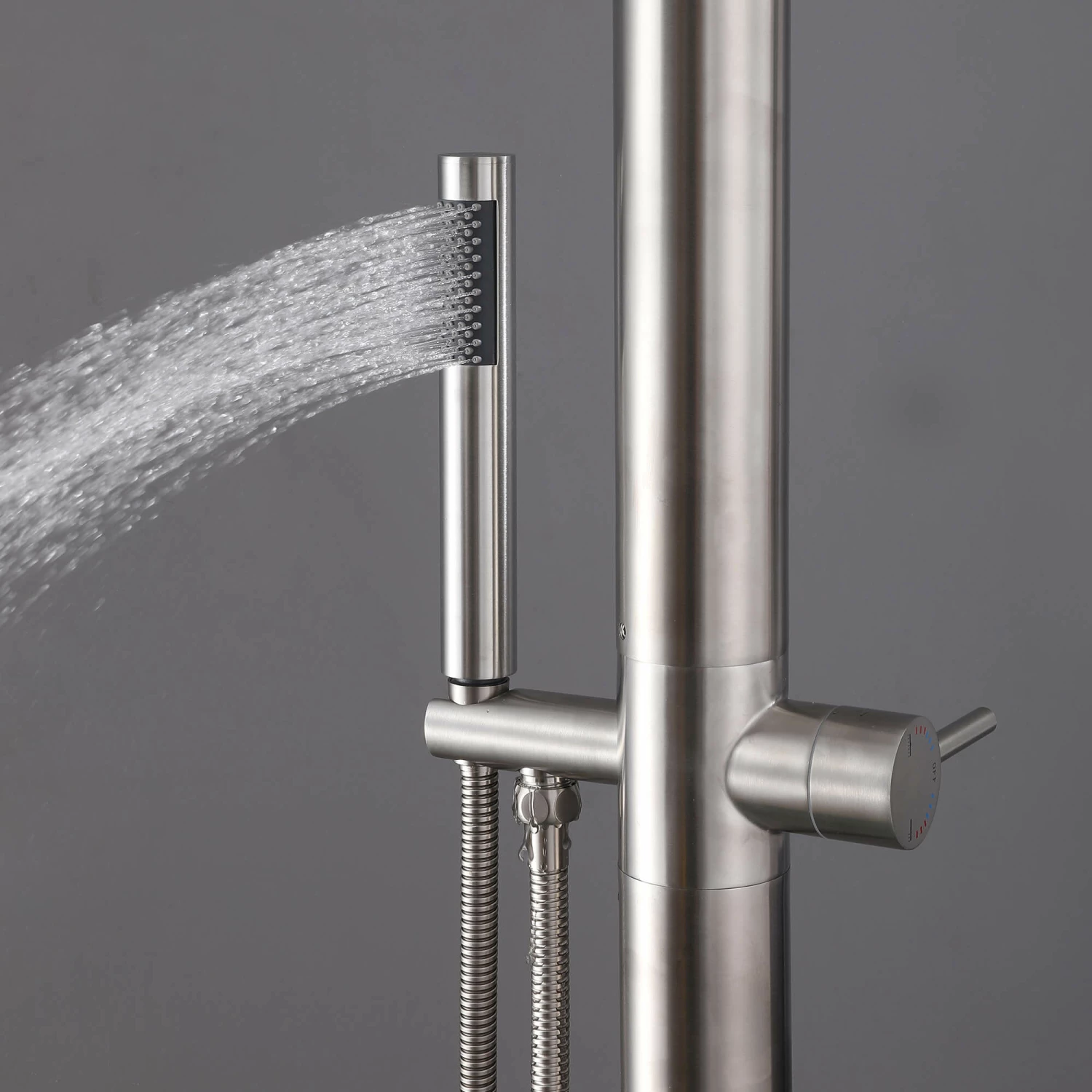 - The main stand is made of stainless steel, its hoses are made of stainless steel, and its handheld showerhead is made with brass, ensuring the shower is corrosion-resistant for outdoor use.