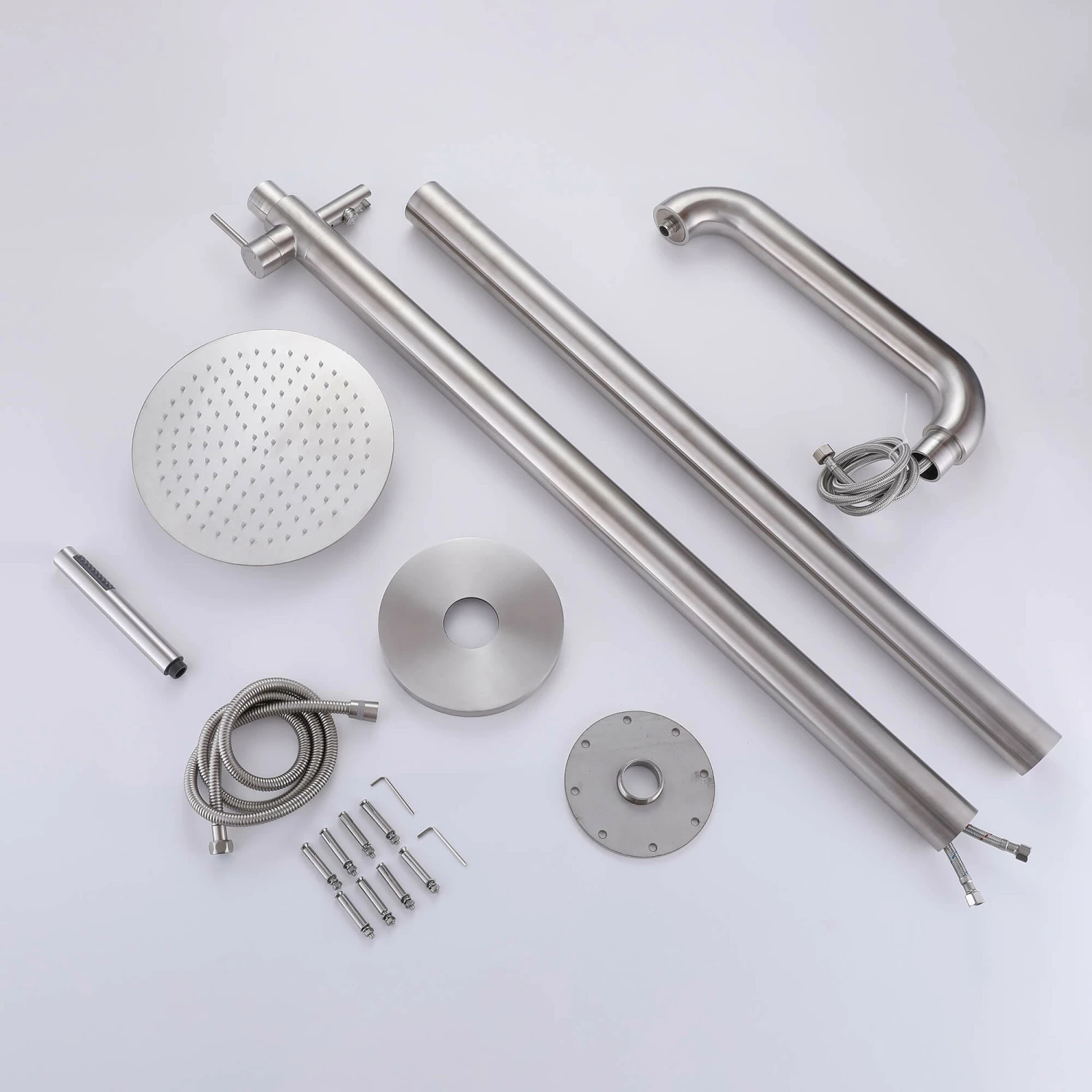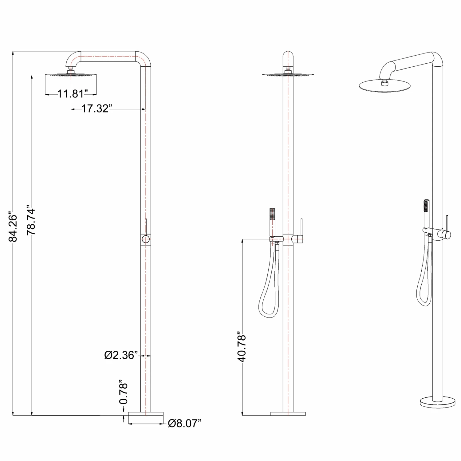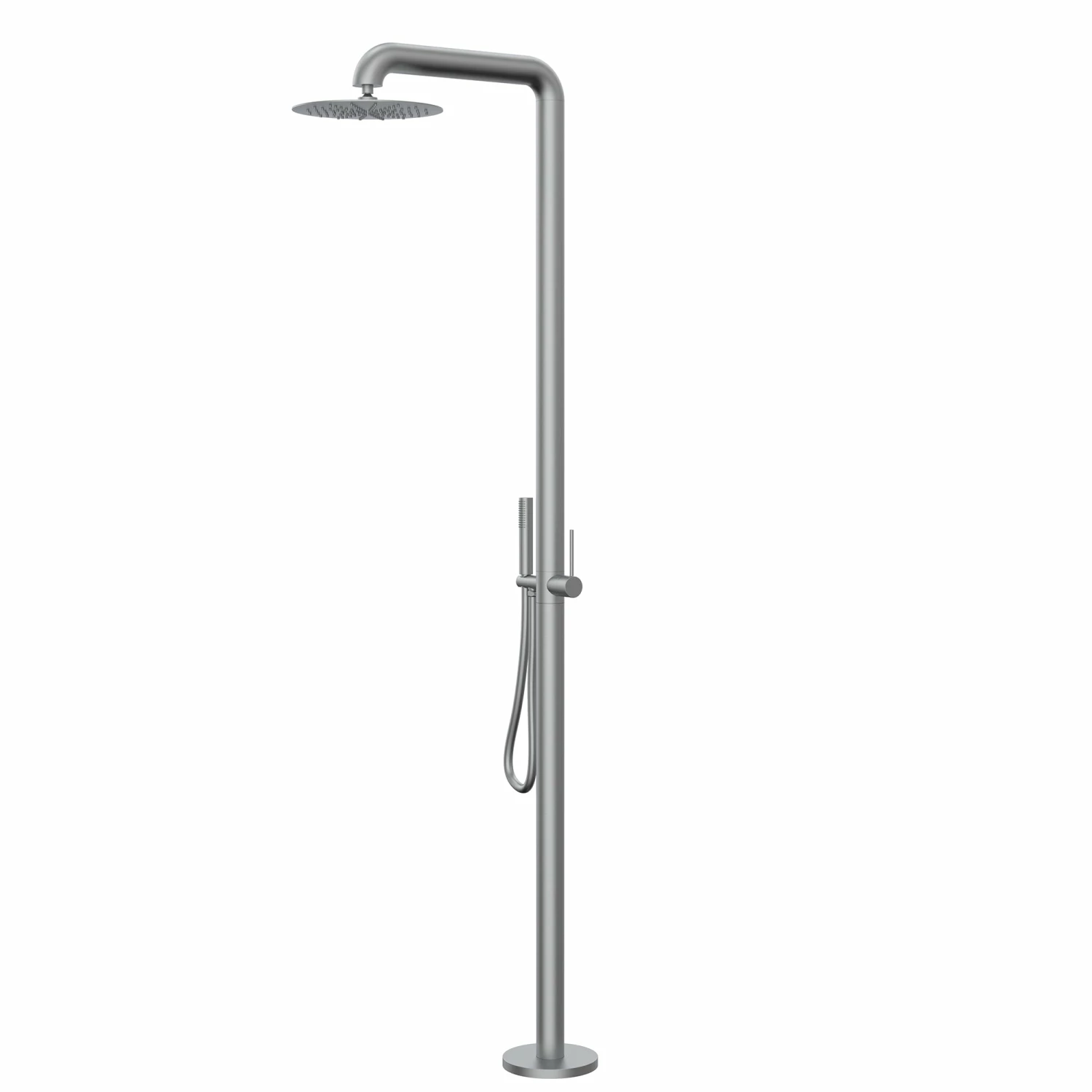 - The main stand is made of stainless steel, its hoses are made of stainless steel, and its handheld showerhead is made with brass, ensuring the shower is corrosion-resistant for outdoor use.