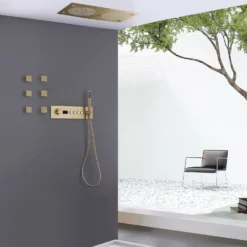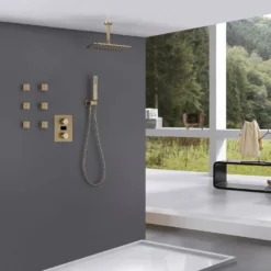 Rainfall Thermostatic Shower System With 3 PCS Body Jets Brushed Gold RB1111