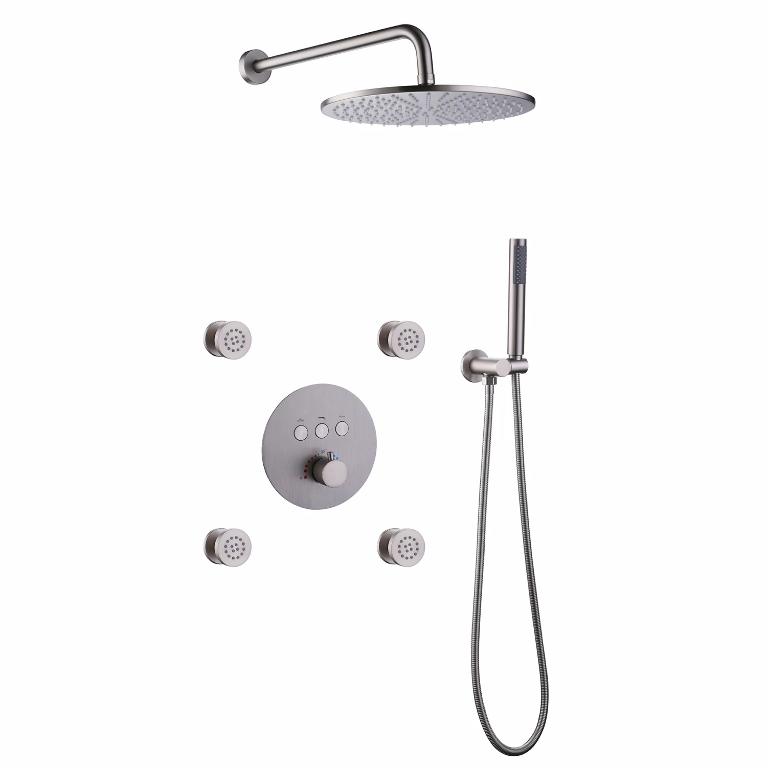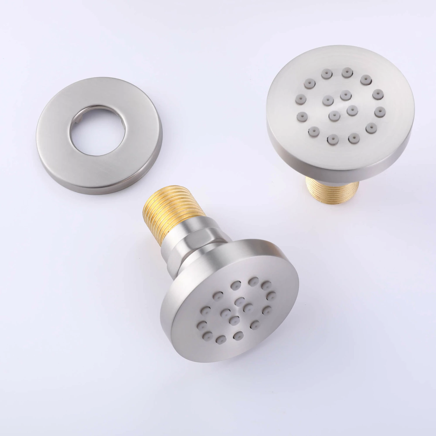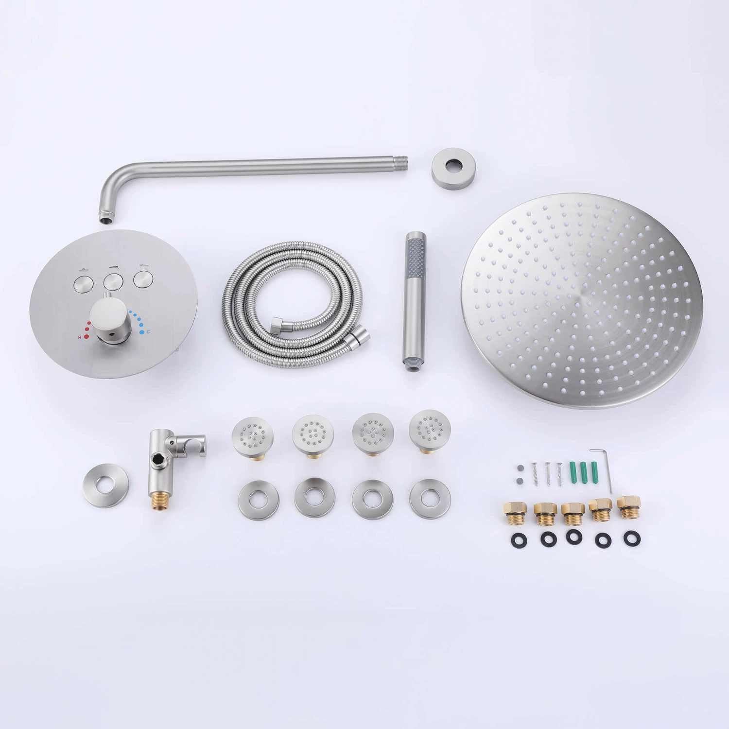 - THE SHOWER JETS SYSTEM — 12 inches round rain shower head (304 stainless steel), 4-inch handheld shower (Brass), 4pcs 2-inch body jets(Brass), 16-inch shower arm (Brass), 59-inch shower hose(PVC), shower holder(Brass), Shower mixer control valve (Brass)