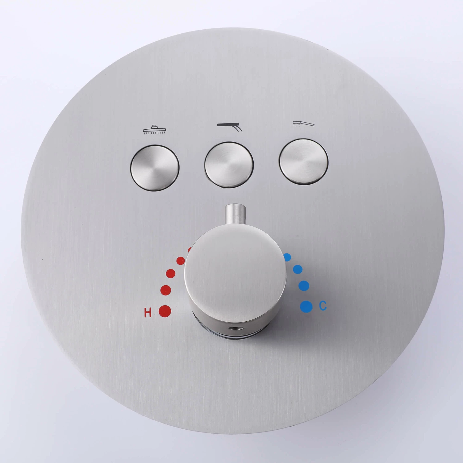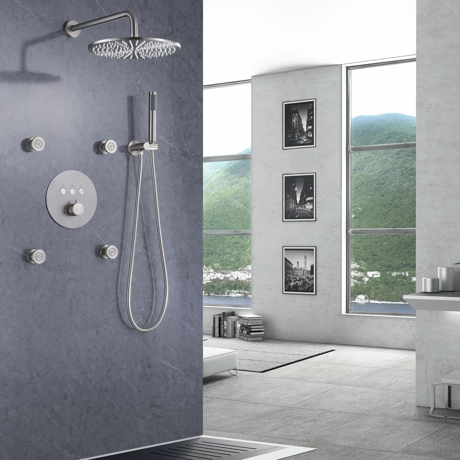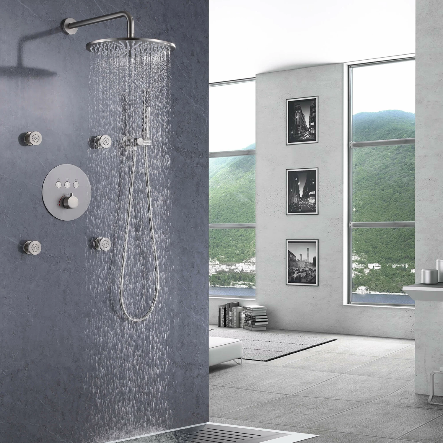 - THE SHOWER JETS SYSTEM — 12 inches round rain shower head (304 stainless steel), 4-inch handheld shower (Brass), 4pcs 2-inch body jets(Brass), 16-inch shower arm (Brass), 59-inch shower hose(PVC), shower holder(Brass), Shower mixer control valve (Brass)