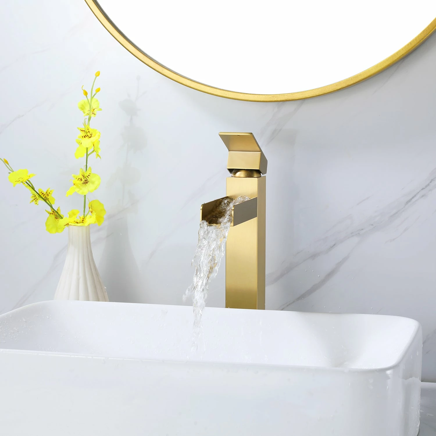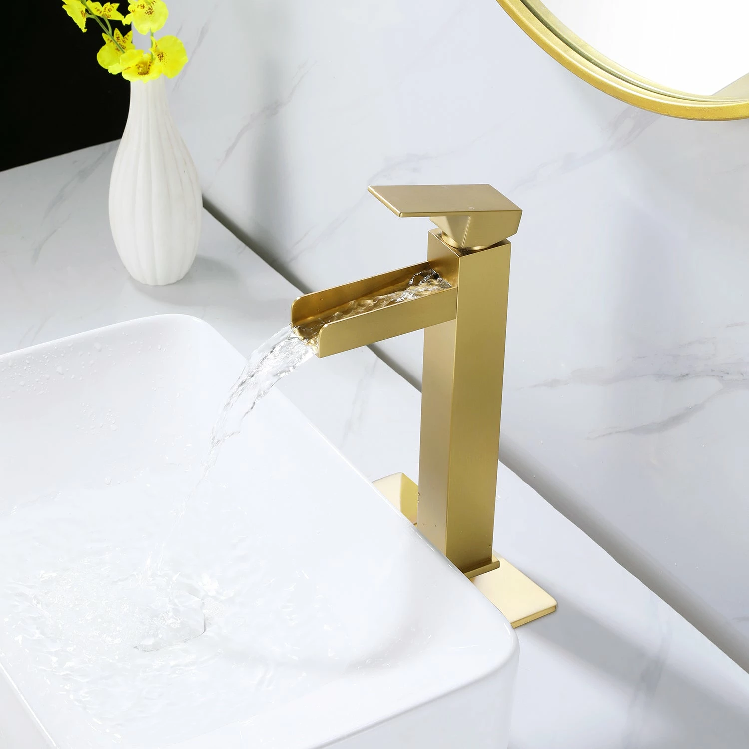 - Single-handle bathroom faucet for easy adjustments to a powerful Waterfall stream.