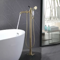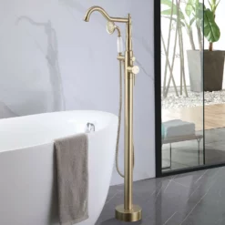 360° Swivel Freestanding Bathtub Faucet With Hand Shower Floor Mount Tub Filler Brushed Gold JK0116