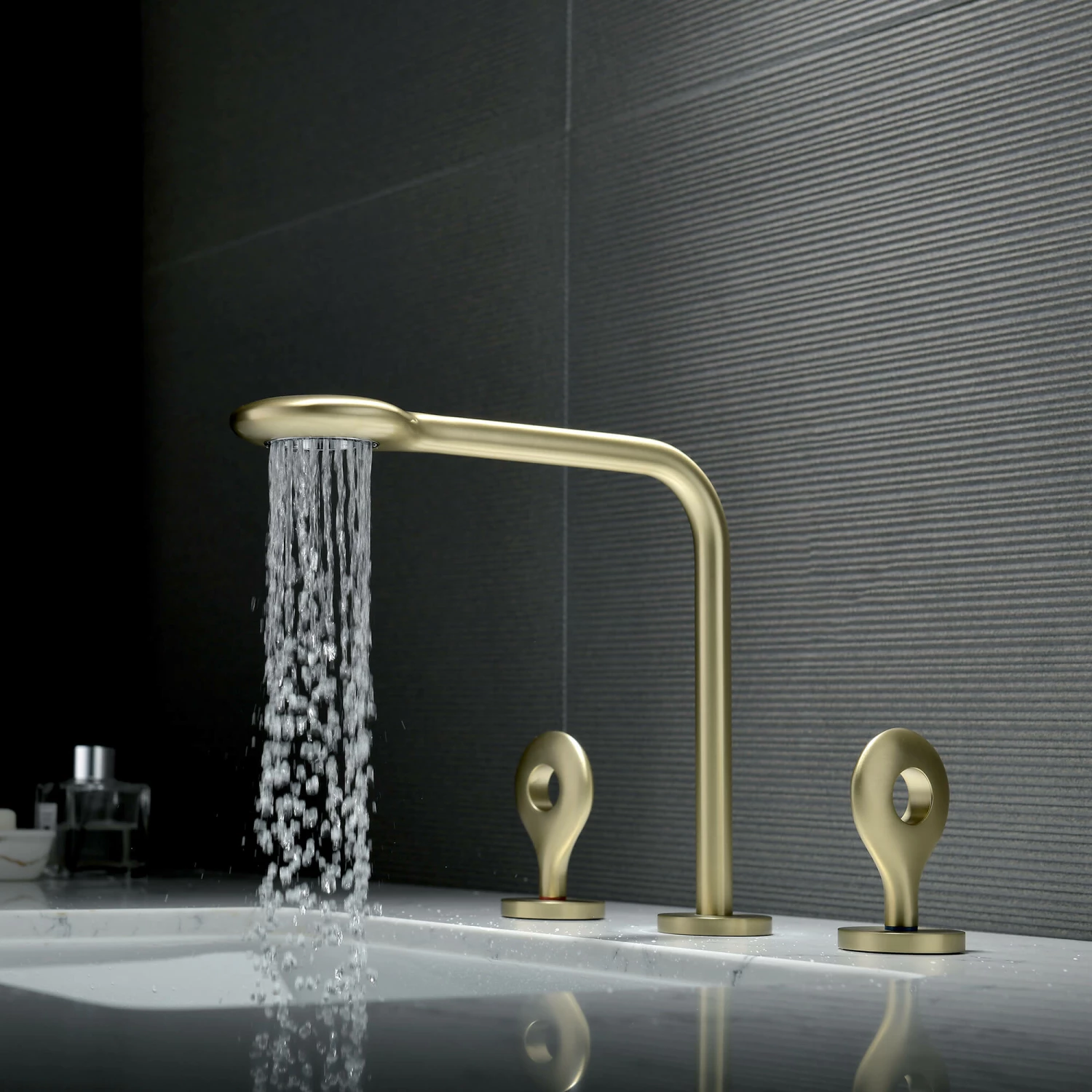 - Double handles for easy control of water temperature and flow, contemporary style rain curtain design with right angle spout which can 360-degree swivel.