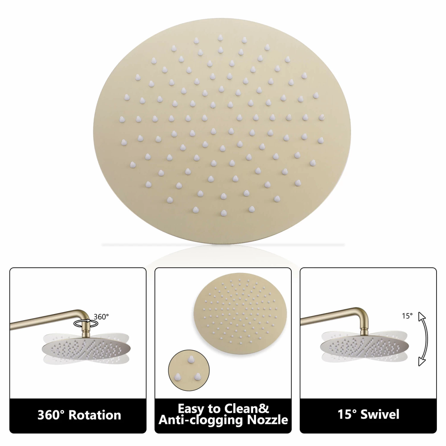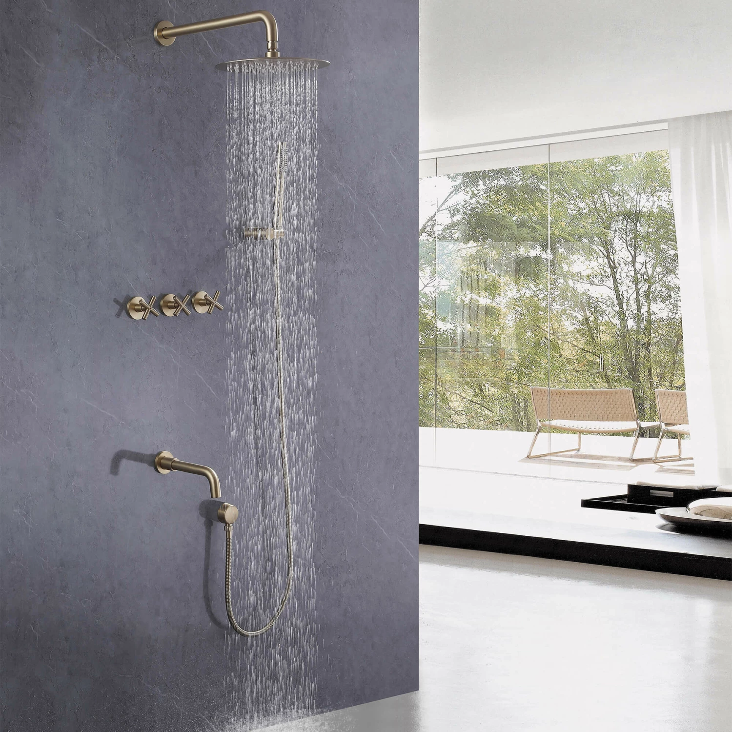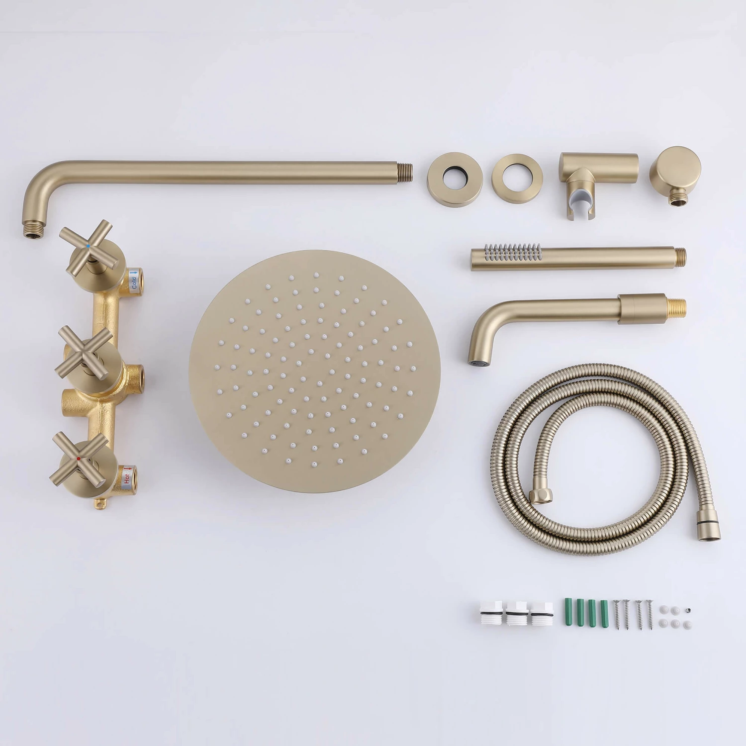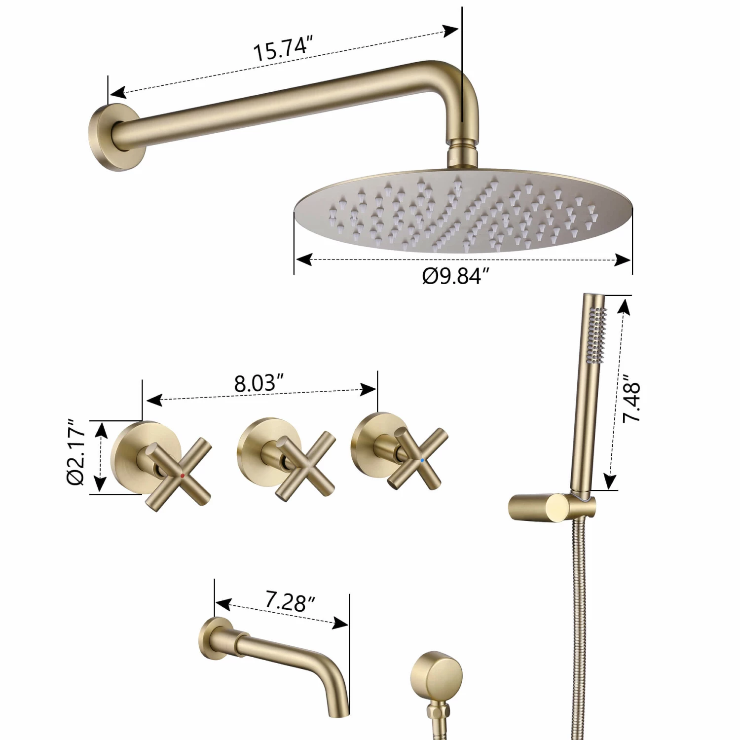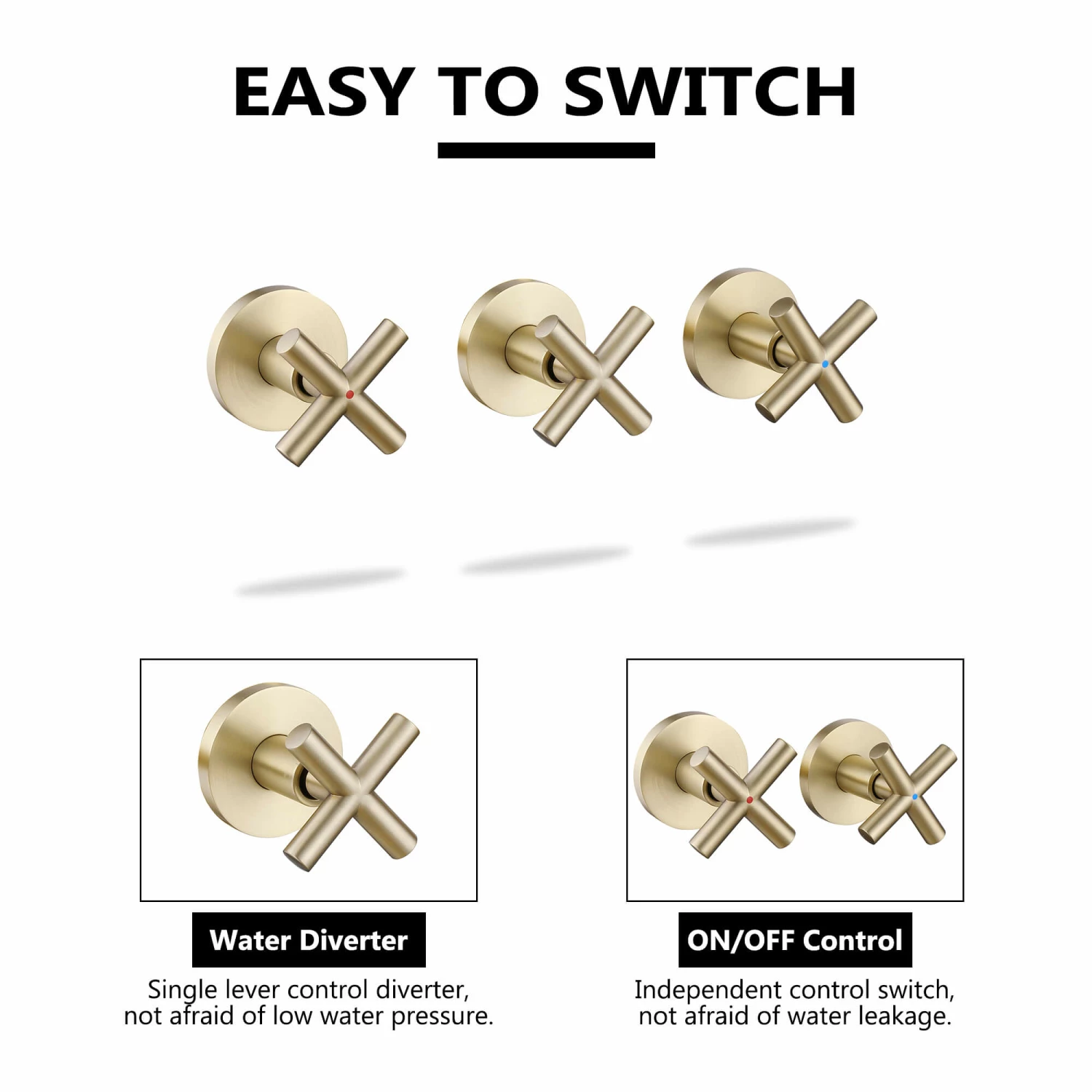 - Classical 3-cross handles easily adjust the water temperature and flow with sleek operations. Ultra-thin 8 inches SUS304 stainless steel shower head, ensuring water saving and providing an aesthetic appeal.