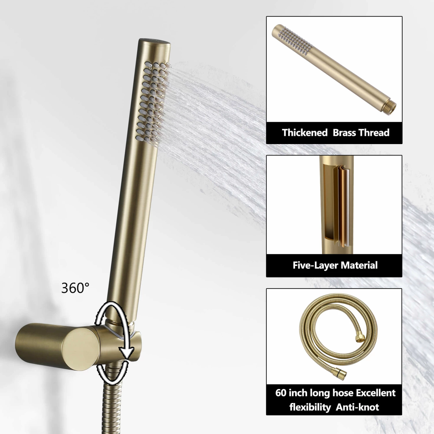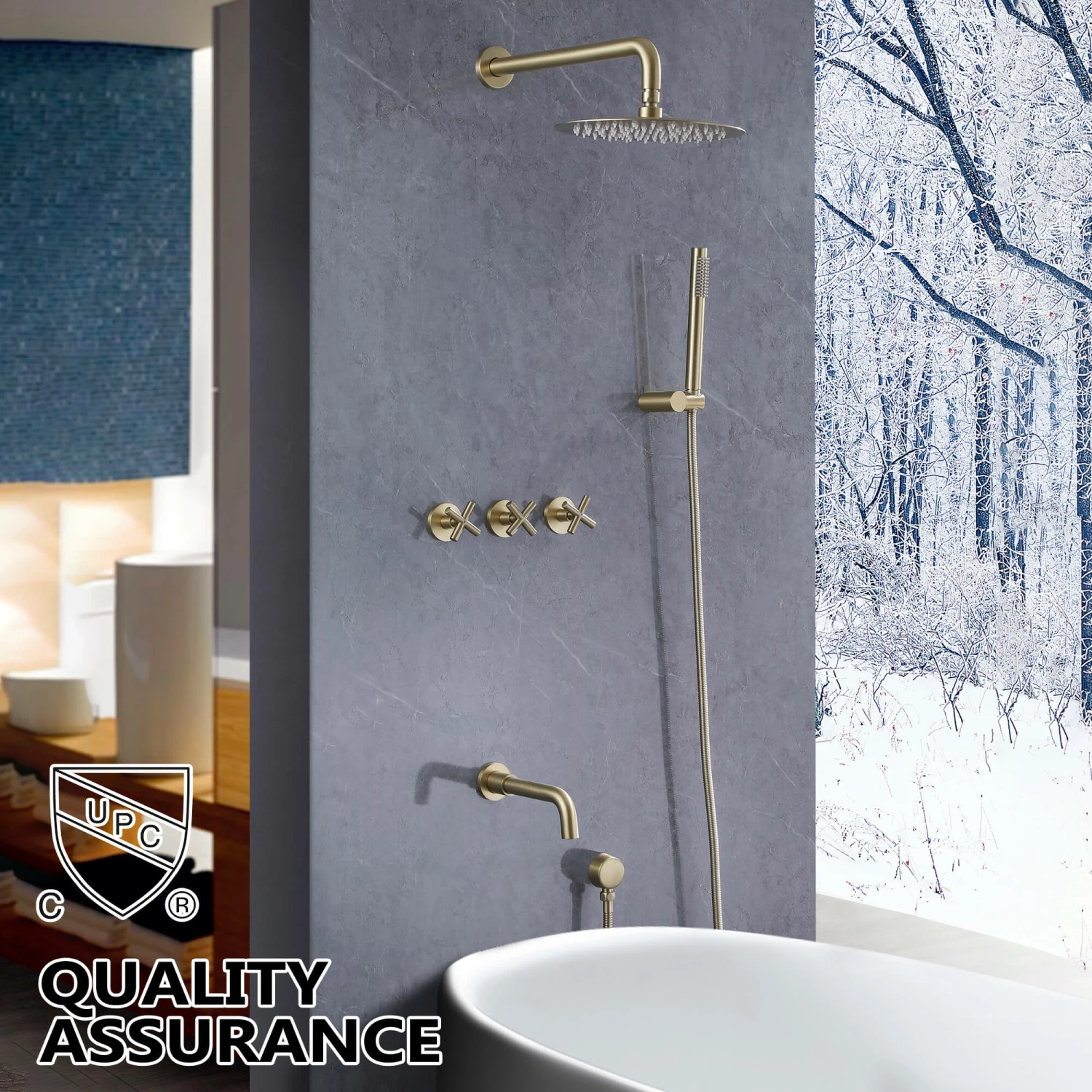 - 3 Handle bathtub and shower faucet set complete with shower head, tub spout, and rough-in valve for your easy installation and saving costs.